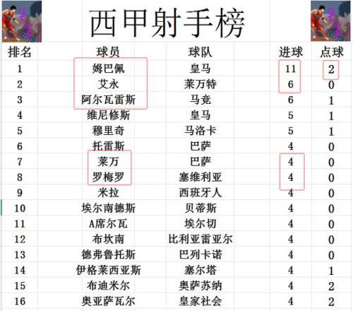 射手榜方面,姆巴佩失点无缘梅开二度,不过打入一球的他也还是继续扩大领先优势,比第2多了5球之多。艾永今天打入一球,追上阿尔瓦雷斯,两人6球并列第2。维尼修斯今天没有进球,还是和穆里奇5球并列第4。莱万缺阵,和奥亚萨瓦尔,罗梅罗等人4球刚好挤入前十。
