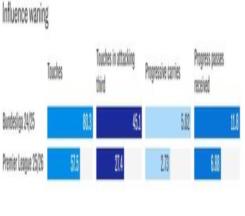 维尔茨的场均触球数从上赛季的80次暴跌至本赛季英超的58次。在进攻区域,这一下降甚至更为明显:他在英超场均最终三区触球27次,而去年在德国时是场均45次。
