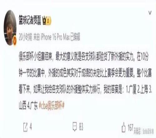 经过休赛期的厉兵秣马,各队的引援工作,如今基本上进入尾声。通过俱乐部杯赛的检验,各队所引进的外援“是骡子是马”,也基本看出了端倪。日前,国内著名体育记者贾磊排出了新赛季的外援实力榜,这位资深媒体人,通过俱乐部杯赛各队的外援表现,分析得出结论,认为外援实力最强的四支球队,分别是广厦男篮、上海男篮、山西男篮和广东男篮。