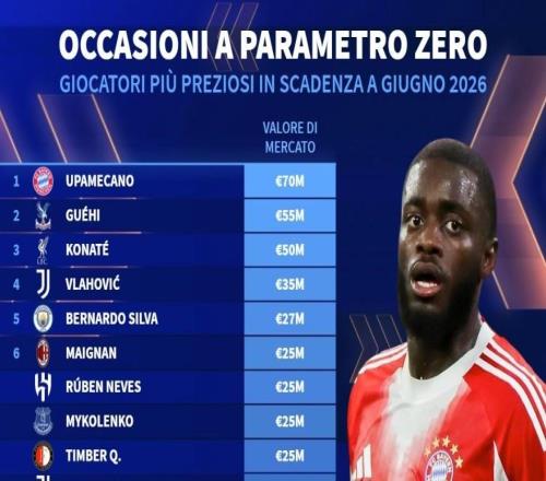 德转列合同今夏到期身价榜:于帕7000万欧第1,格伊5500万第2
