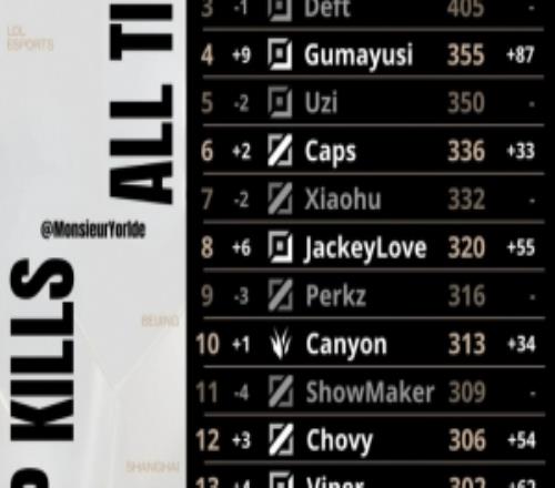 全球总决赛总击杀数榜单:Ruler来到第二位,Gumayusi第四 -